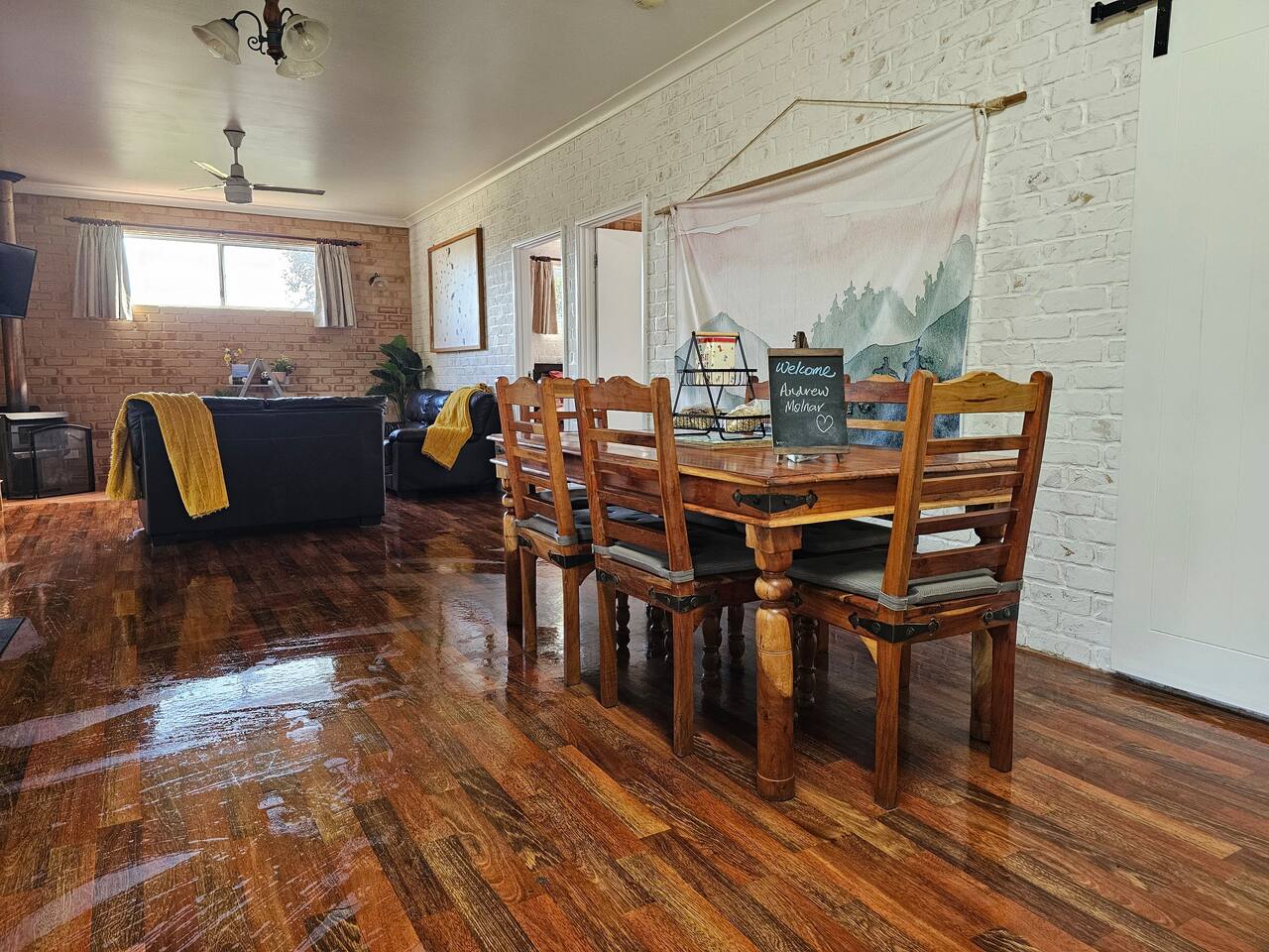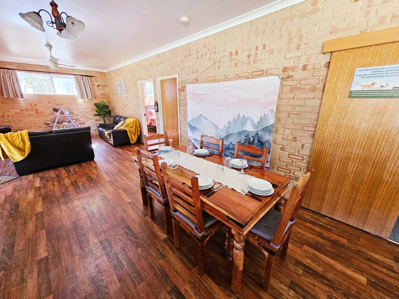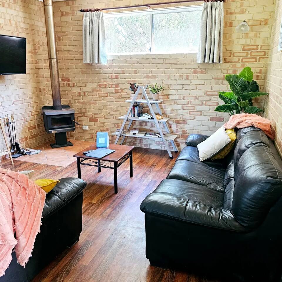 Home & Hound Stirling house is a 117sqm double brick 2 bedroom chalet accomodation. Situated on a small farm with opportunity to hand feed the goats, ponies, collect eggs from the chickens, and generally relax in the quiet countryside. This chalet has a large bedroom with queen bed, and a second large bedroom with 3 single beds. A combined bathroom and laundry with washing machine, and a fully self contained kitchen. Dog friendly with a secure yard so you can leave your pet in for day trips.